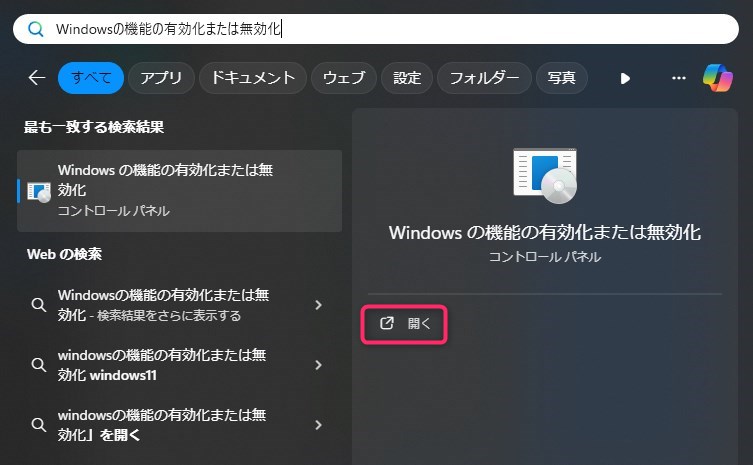 スタートメニューをクリックしたら出てくる、メニューの上の検索窓に「Windowsの機能の有効化または無効化」と入力します。