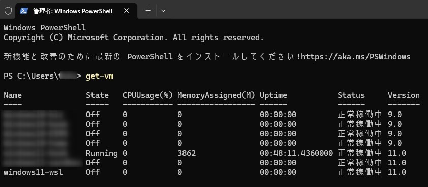 このリストから有効にしたい仮想マシンの名前(今回は「windows11-wsl」)を確認します。
