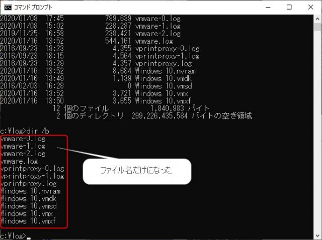 そのフォルダーに含まれるファイル情報が表示されるのですが、日付や赤枠で囲った様な不要な情報まで表示されました。それらの表示を消すのが「/b」スイッチになります。