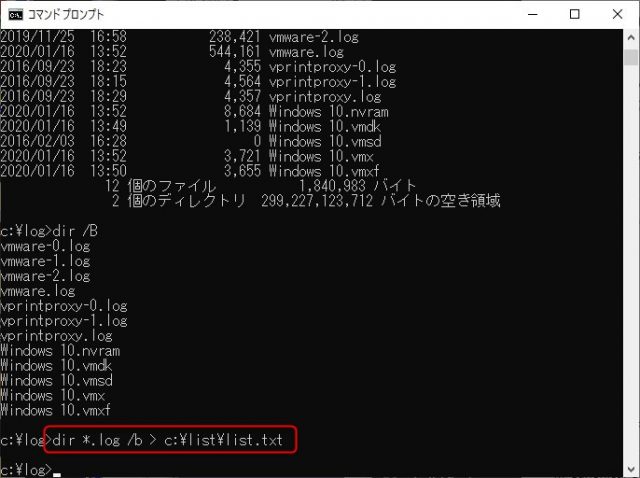 実際に入力すると特にメッセージも出ないのですが、次の行が表示されれば該当フォルダーには指定されたファイル名だけのリストが作成されています。