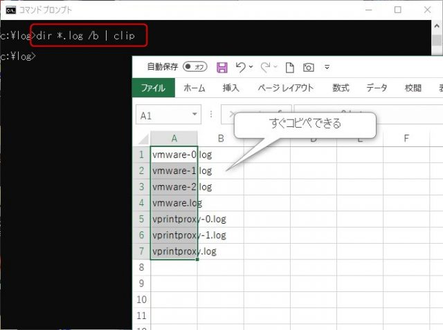 またテキストファイルにせず、直接エクセルに貼り付けたりしたい場合は「| clip」と入力します。