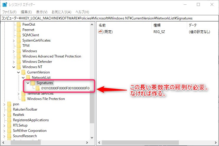 - 起動したら左側のツリーから「コンピューター」→「HKEY_LOCAL_MACHINE」→「SOFTWARE」→「Policies」→「Microsoft」→「Windows NT」→「CurrentVersion」→「NetworkList」→「Signatures」を順番に選択する