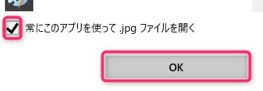 見つけてクリックしたら、「常にこのアプリを使って.jpgファイルを開く」等の「常に~ファイルを開く」のチェックを入れてからOKをクリックして下さい。