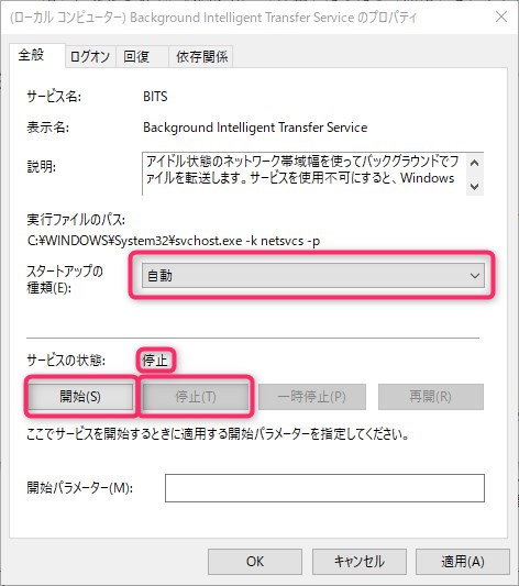 するとプロバティ画面が表示されるので、スタートアップの種類を「自動」に変えたら下のボタンで「停止」をクリックします。止まった後に「開始」をクリックして状態を「開始」に変更します。状態が元々「停止」だったら「開始」をクリックするだけで大丈夫です。
