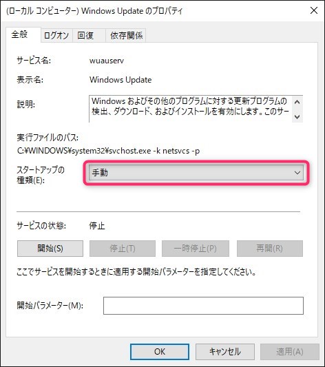 にしてください。これはWindowsUpdateを実行すれば起動する物なので手動のままにして問題が無いからです。